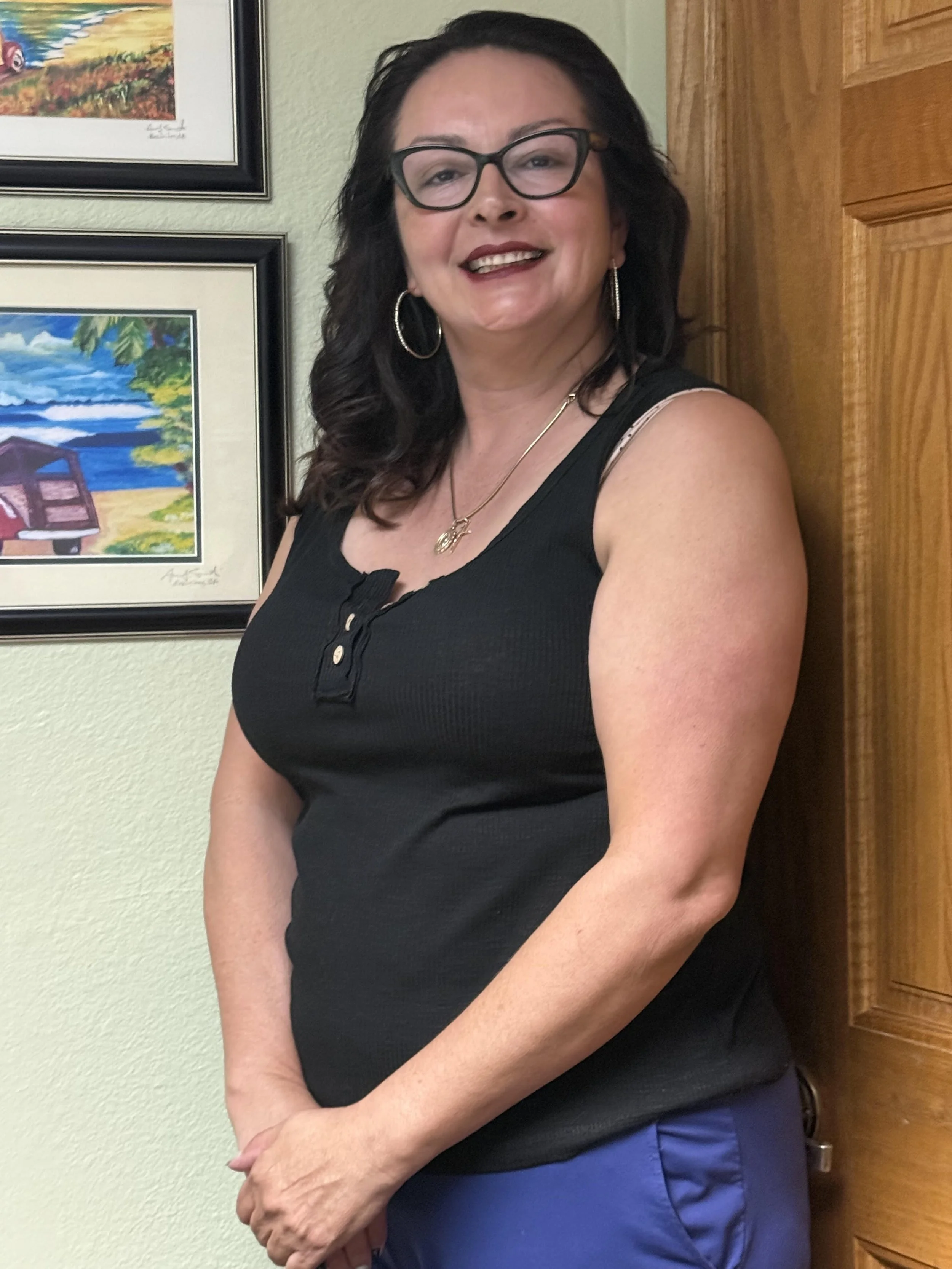 Angela manages treatment plans, overseeing operations, Insurance, and the business side of the practice.